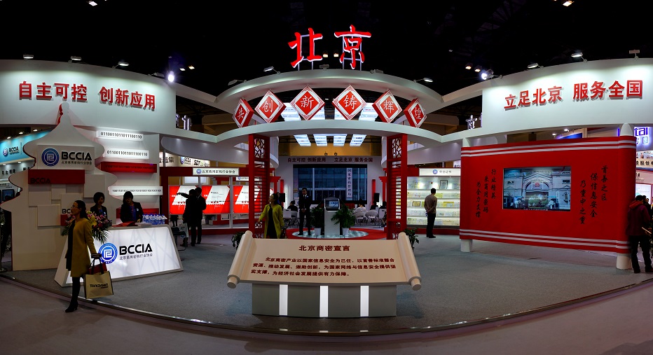 北京展区独立设在12号馆,参展企业36家,占地面积1361平米,是本次展览中省区市参展企业数量最多、展区面积最大的一个。北京展区的主题为:“自主可控、创新应用、立足北京、服务全国”。北京展区展示了北京商用密码发展历程及应用成果,涉及广电网、电信网等国家基础信息网络;医疗卫生、金融、税务、保险、公安、社会保障、交通等重要信息系统;电力等重要工业控制系统;面向社会服务的政务信息系统的应用成果,以及物联网、云计算等重大领域的创新示范。